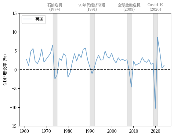 英国 (UK) 的模式与美国类似,增长率缓慢下降,波动显著。