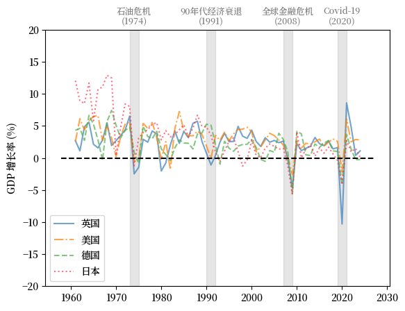 增长率的大幅下降与 1970 年代的石油危机、全球金融危机(GFC)和 Covid-19 大流行同时发生。