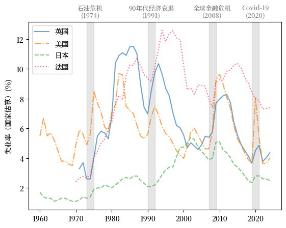 这里我们比较了美国、英国、日本和法国的失业率。
