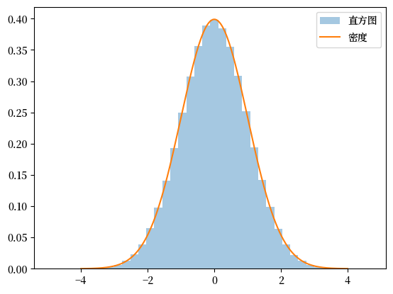 我们可以通过绘制密度图和展示观测值的直方图来看到这一点,如下代码所示(假设 \(\mu=0\) 和 \(\sigma=1\))。