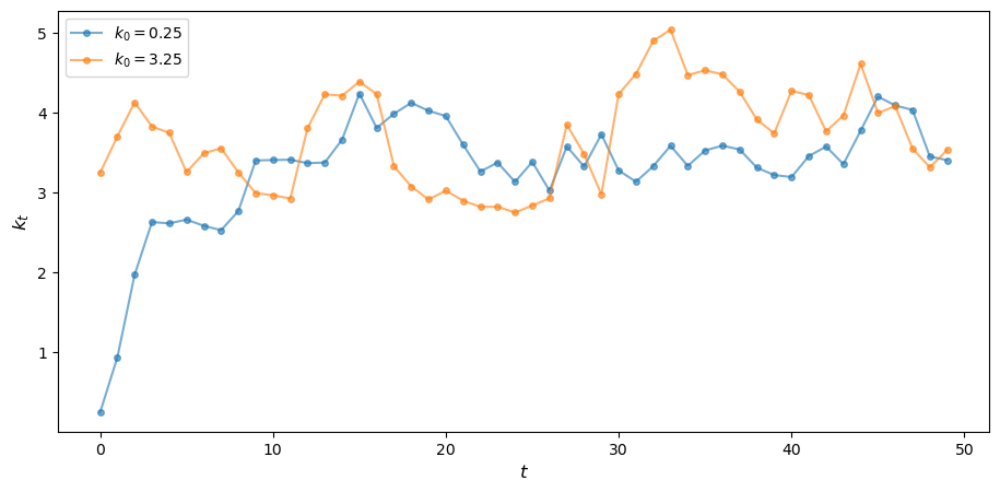 我们的目标是在给定外生初始资本存量 \(k_0\) 的条件下,研究 \(k_t\) 随时间演变的规律。