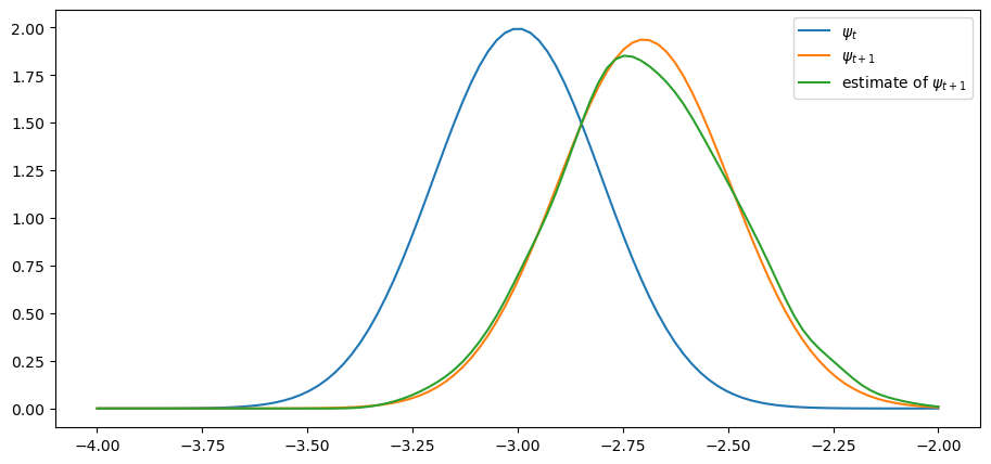 First, plot \(\psi_t\) and \(\psi_{t+1}\) using the true distributions described above.