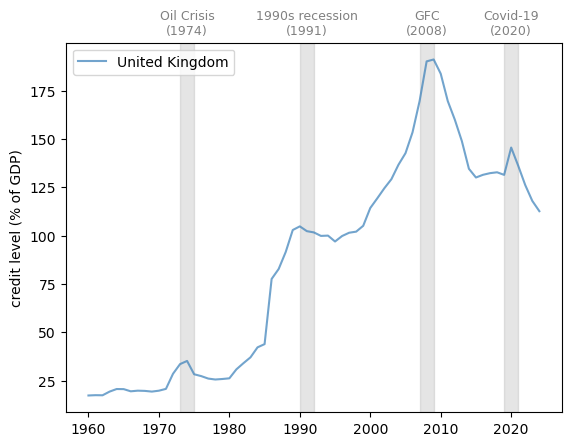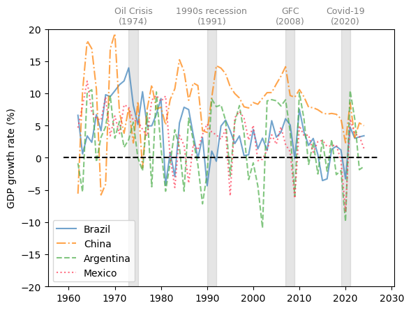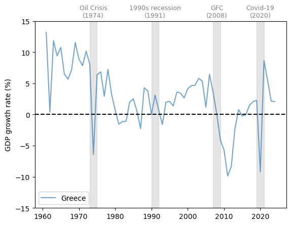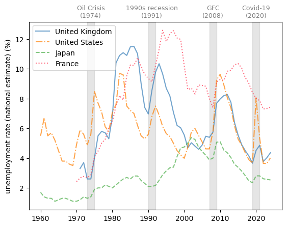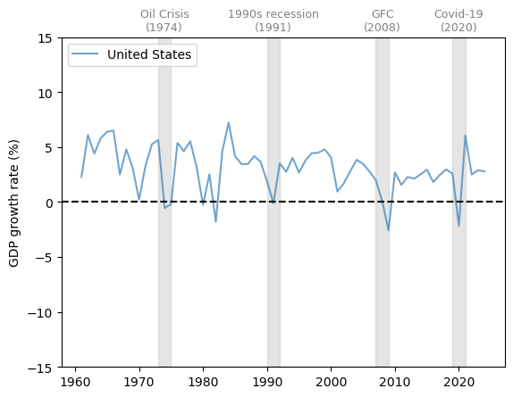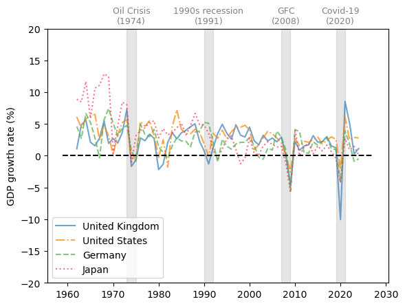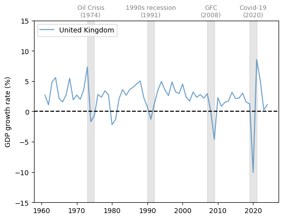 defplot_series(data,country,ylabel,txt_pos,ax,g_params,b_params,t_params,ylim=15,baseline=0):""" Plots a time series with recessions highlighted. Parameters ---------- data : pd.DataFrame Data to plot country : str Name of the country to plot ylabel : str Label of the y-axis txt_pos : float Position of the recession labels y_lim : float Limit of the y-axis ax : matplotlib.axes._subplots.AxesSubplot Axes to plot on g_params : dict Parameters for the line b_params : dict Parameters for the recession highlights t_params : dict Parameters for the recession labels baseline : float, optional Dashed baseline on the plot, by default 0 Returns ------- ax : matplotlib.axes.Axes Axes with the plot. """ax.plot(data.loc[country],label=country,**g_params)# Highlight recessionsax.axvspan(1973,1975,**b_params)ax.axvspan(1990,1992,**b_params)ax.axvspan(2007,2009,**b_params)ax.axvspan(2019,2021,**b_params)ifylim!=None:ax.set_ylim([-ylim,ylim])else:ylim=ax.get_ylim()[1]ax.text(1974,ylim+ylim*txt_pos,'Oil Crisis\n(1974)',**t_params)ax.text(1991,ylim+ylim*txt_pos,'1990s recession\n(1991)',**t_params)ax.text(2008,ylim+ylim*txt_pos,'GFC\n(2008)',**t_params)ax.text(2020,ylim+ylim*txt_pos,'Covid-19\n(2020)',**t_params)# Add a baseline for referenceifbaseline!=None:ax.axhline(y=baseline,color='black',linestyle='--')ax.set_ylabel(ylabel)ax.legend()returnax# Define graphical parameters g_params={'alpha':0.7}b_params={'color':'grey','alpha':0.2}t_params={'color':'grey','fontsize':9,'va':'center','ha':'center'}
