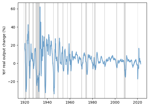 start_date=datetime.datetime(1919,1,1)end_date=datetime.datetime(2022,12,31)nber=web.DataReader('USREC','fred',start_date,end_date)industrial_output=web.DataReader('INDPRO','fred',start_date,end_date).pct_change(12)*100fig,ax=plt.subplots()ax.plot(industrial_output,**g_params,color='#377eb8',linestyle='-',linewidth=2,label='Industrial production index')ax.fill_between(nber.index,0,1,where=nber['USREC']==1,color='grey',edgecolor='none',alpha=0.3,transform=ax.get_xaxis_transform(),label='NBER recession indicators')ax.set_ylim([ax.get_ylim()[0],ax.get_ylim()[1]])ax.set_ylabel('YoY real output change (%)')plt.show()