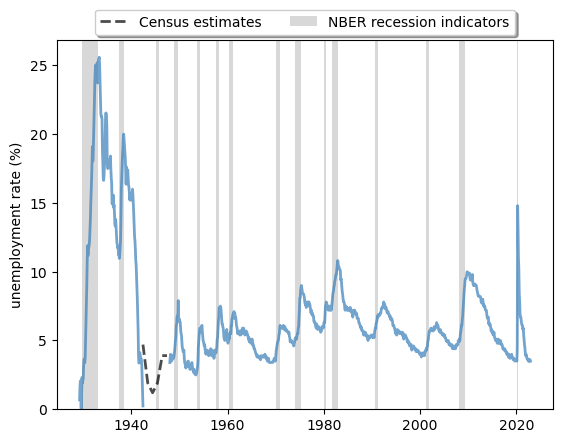 # We use the census bureau's estimate for the unemployment rate # between 1942 and 1948years=[datetime.datetime(year,6,1)foryearinrange(1942,1948)]unrate_census=[4.7,1.9,1.2,1.9,3.9,3.9]unrate_census={'DATE':years,'UNRATE':unrate_census}unrate_census=pd.DataFrame(unrate_census)unrate_census.set_index('DATE',inplace=True)# Obtain the NBER-defined recession periodsstart_date=datetime.datetime(1929,1,1)end_date=datetime.datetime(2022,12,31)nber=web.DataReader('USREC','fred',start_date,end_date)fig,ax=plt.subplots()ax.plot(unrate_history,**g_params,color='#377eb8',linestyle='-',linewidth=2)ax.plot(unrate_census,**g_params,color='black',linestyle='--',label='Census estimates',linewidth=2)ax.plot(unrate,**g_params,color='#377eb8',linestyle='-',linewidth=2)# Draw gray boxes according to NBER recession indicatorsax.fill_between(nber.index,0,1,where=nber['USREC']==1,color='grey',edgecolor='none',alpha=0.3,transform=ax.get_xaxis_transform(),label='NBER recession indicators')ax.set_ylim([0,ax.get_ylim()[1]])ax.legend(loc='upper center',bbox_to_anchor=(0.5,1.1),ncol=3,fancybox=True,shadow=True)ax.set_ylabel('unemployment rate (%)')plt.show()