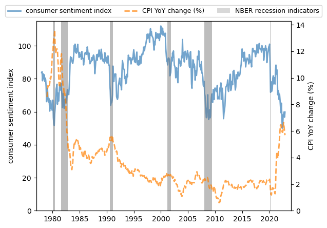 start_date=datetime.datetime(1978,1,1)end_date=datetime.datetime(2022,12,31)# Limit the plot to a specific rangestart_date_graph=datetime.datetime(1977,1,1)end_date_graph=datetime.datetime(2023,12,31)nber=web.DataReader('USREC','fred',start_date,end_date)consumer_confidence=web.DataReader('UMCSENT','fred',start_date,end_date)fig,ax=plt.subplots()ax.plot(consumer_confidence,**g_params,color='#377eb8',linestyle='-',linewidth=2)ax.fill_between(nber.index,0,1,where=nber['USREC']==1,color='grey',edgecolor='none',alpha=0.3,transform=ax.get_xaxis_transform(),label='NBER recession indicators')ax.set_ylim([0,ax.get_ylim()[1]])ax.set_ylabel('consumer sentiment index')# Plot CPI on another y-axisax_t=ax.twinx()inflation=web.DataReader('CPILFESL','fred',start_date,end_date).pct_change(12)*100# Add CPI on the legend without drawing the line againax_t.plot(2020,0,**g_params,linestyle='-',linewidth=2,label='consumer sentiment index')ax_t.plot(inflation,**g_params,color='#ff7f00',linestyle='--',linewidth=2,label='CPI YoY change (%)')ax_t.fill_between(nber.index,0,1,where=nber['USREC']==1,color='grey',edgecolor='none',alpha=0.3,transform=ax.get_xaxis_transform(),label='NBER recession indicators')ax_t.set_ylim([0,ax_t.get_ylim()[1]])ax_t.set_xlim([start_date_graph,end_date_graph])ax_t.legend(loc='upper center',bbox_to_anchor=(0.5,1.1),ncol=3,fontsize=9)ax_t.set_ylabel('CPI YoY change (%)')plt.show()