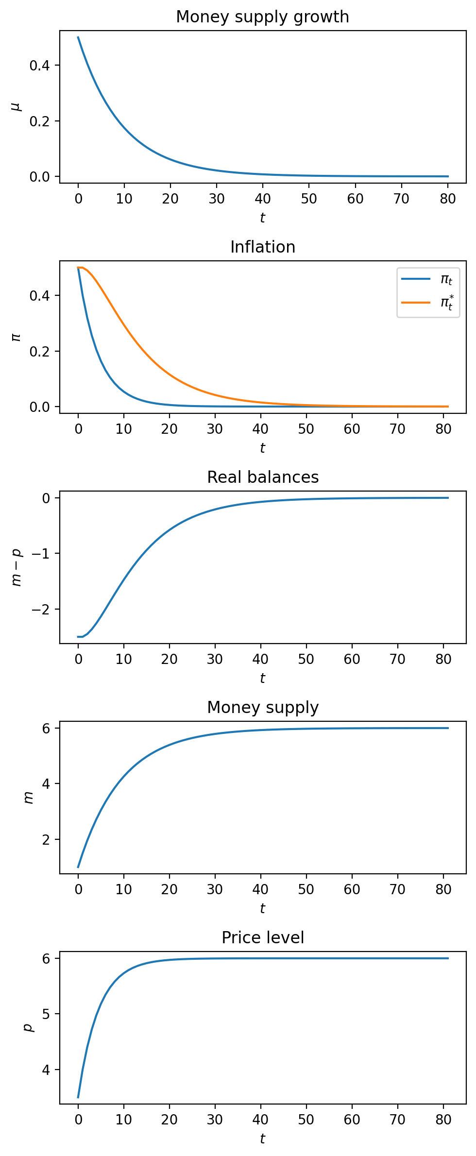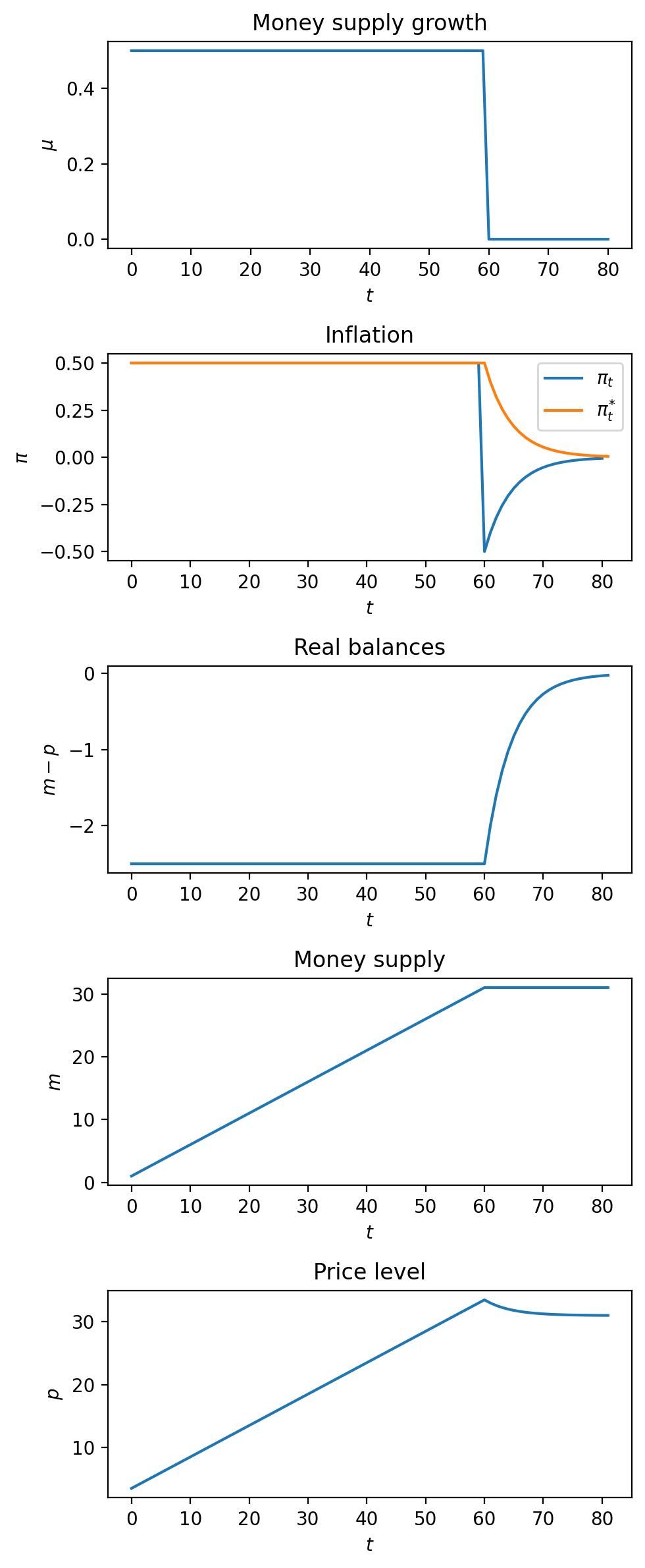 subplot_title = [r'Money supply growth', r'Inflation', r'Real balances', r'Money supply', r'Price level']