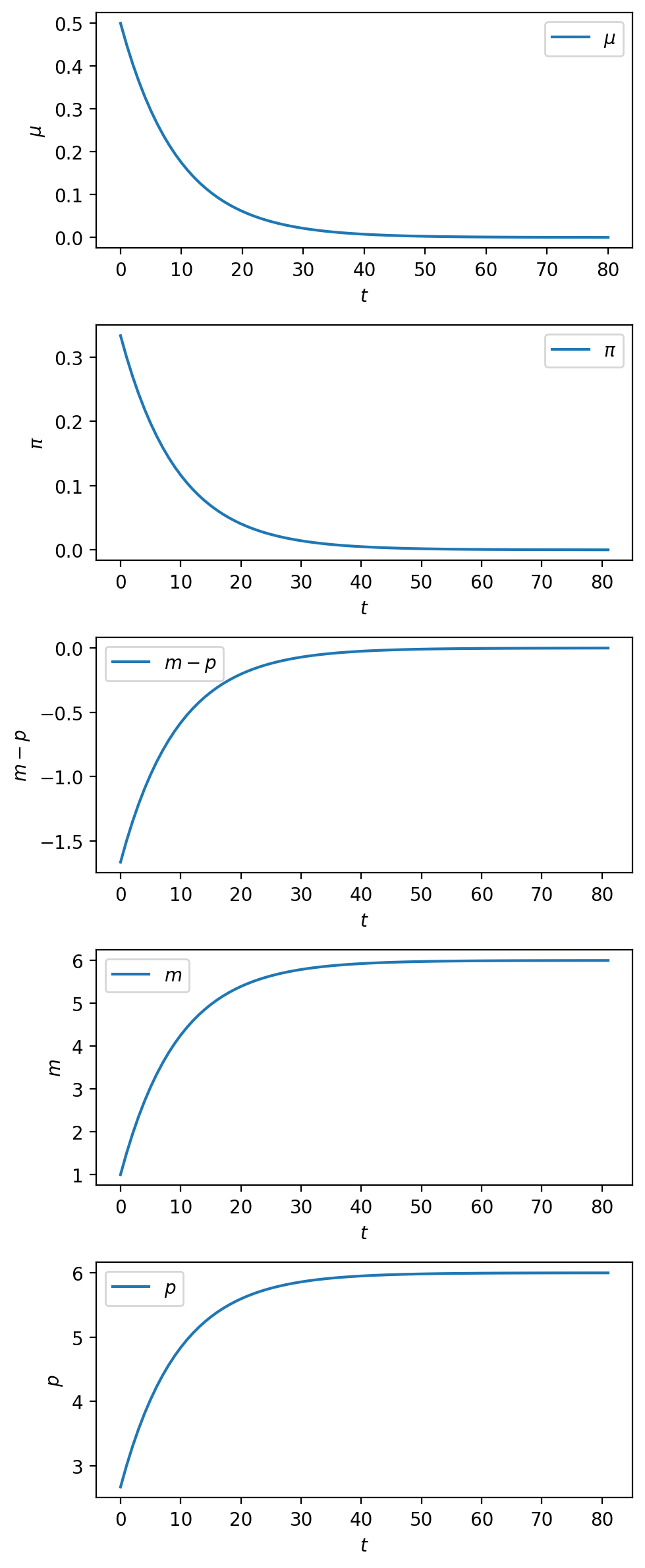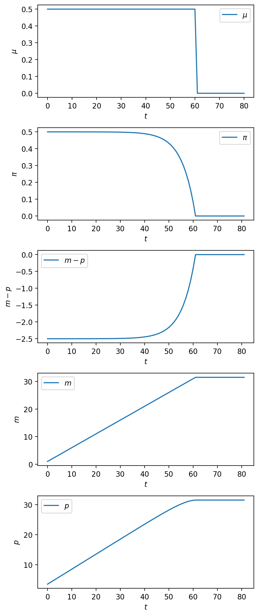 Now we can solve the model to compute \(\pi_t\), \(m_t\) and \(p_t\) for \(t =1, \ldots, T+1\) using the matrix equation above