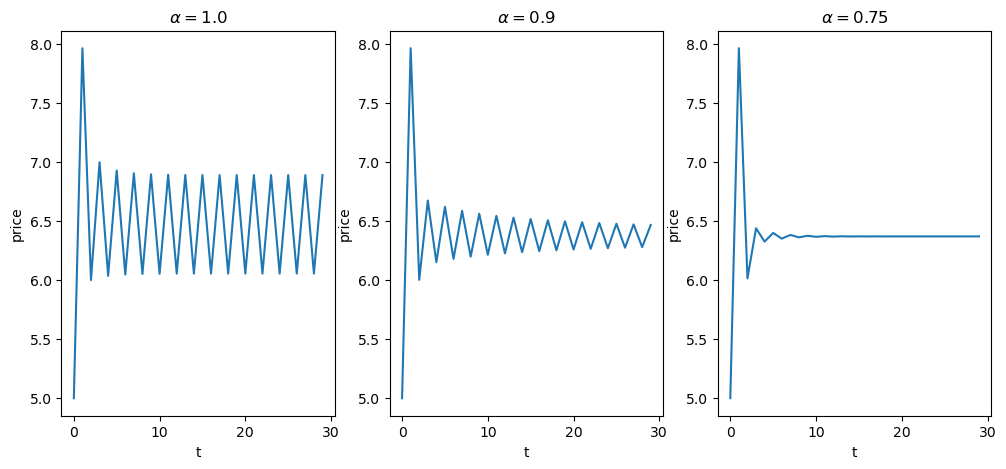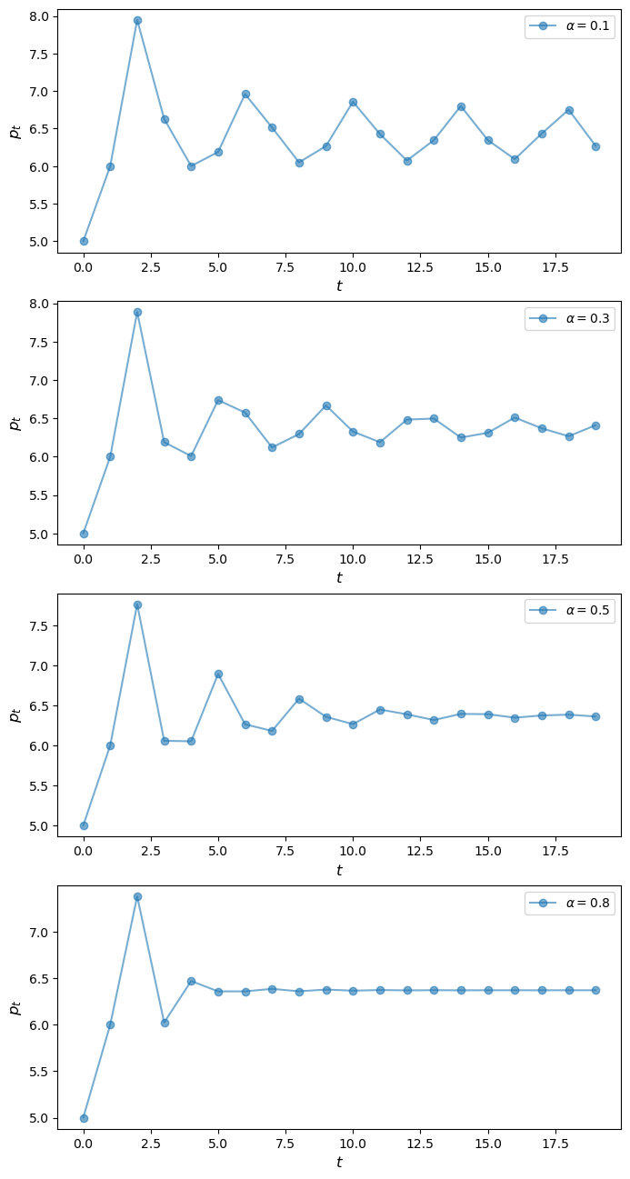 The function below plots price dynamics under adaptive expectations for different values of \(\alpha\).