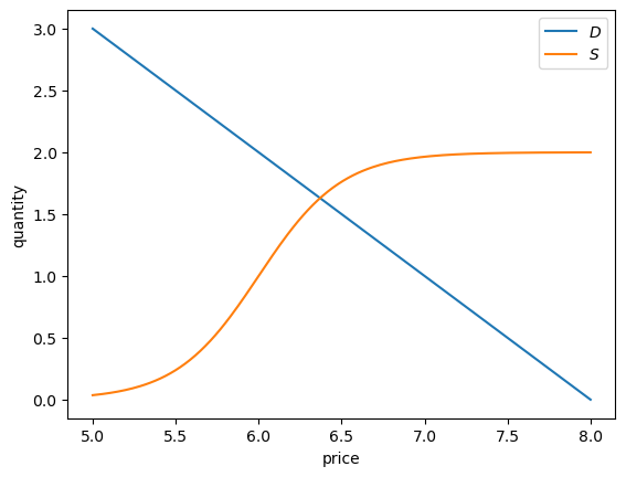 Let’s make a plot of supply and demand for particular choices of the parameter values.