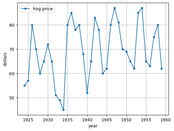 ax.plot(years, hog_prices, '-o', ms=4, label='hog price')