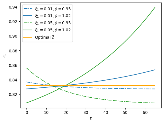 We visualize variations for \(\xi_1 \in \{.01, .05\}\) and \(\phi \in \{.95, 1.02\}\)