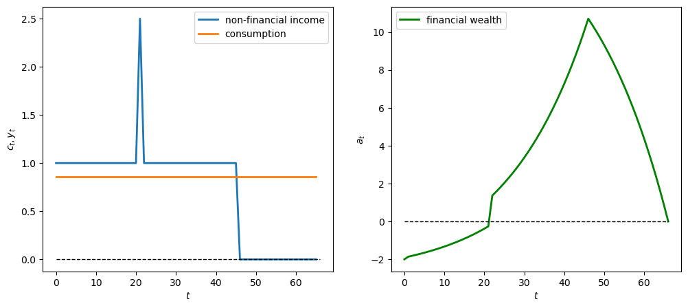 The above procedure seems like a sensible way to find “budget-feasible” consumption paths \(c\), i.e., paths that are consistent with the exogenous non-financial income stream \(y\), the initial financial asset level \(a_0\), and the terminal asset level \(a_{T+1}\).