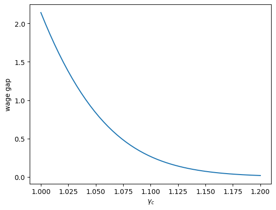 Notice how the initial wage gap falls when the rate of growth \(\gamma_c\) of college wages rises.
