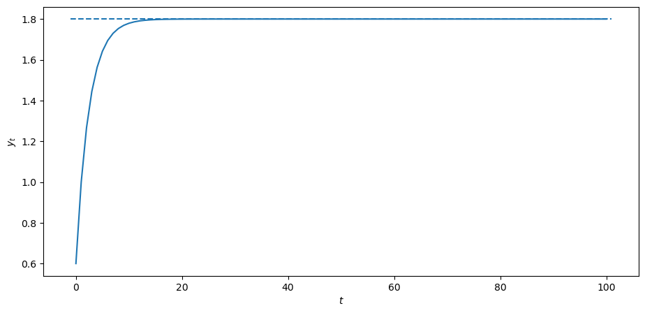 We will now go back to the case of the Keynesian multiplier and plot the time path of \(y_t\), given that consumption is a constant fraction of national income, and investment is fixed.