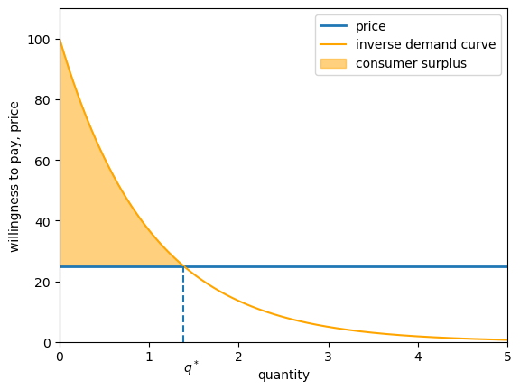 The idea is that the inverse demand curve \(d_0 - d_1 q\) shows a consumer’s willingness to pay for an additional increment of the good at a given quantity \(q\).