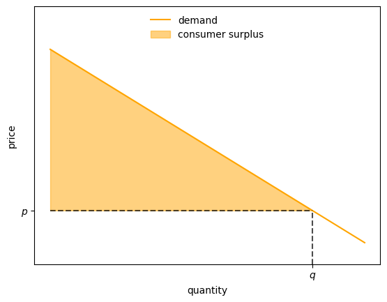 As before, consumer surplus at \(q\) is the area under the demand curve minus price times quantity: