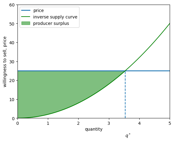 We define producer surplus as \(p q\) minus the area under an inverse supply curve