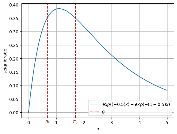 Fig. 32.1 Seigniorage as function of steady-state inflation. The dashed brown lines indicate \(\pi_l\) and \(\pi_u\).#
