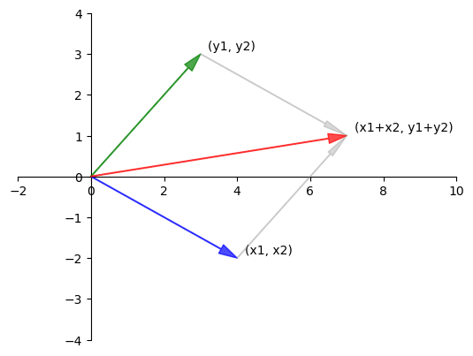 We can visualise vector addition in \(\mathbb{R}^2\) as follows.