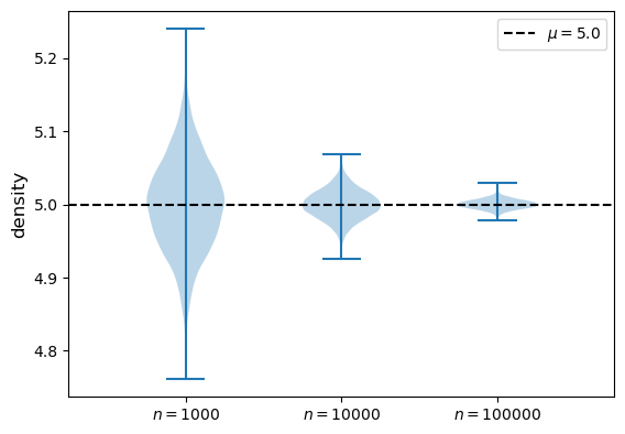 Moreover, if we repeat the exercise with a larger value of \(n\), we should see that the observations are even more tightly clustered around the population mean.