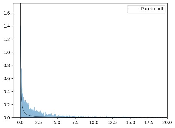 ax.plot(x, dist_pareto_tail.pdf(x), 'k-', lw=0.5, label='pareto pdf')