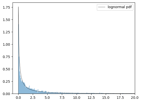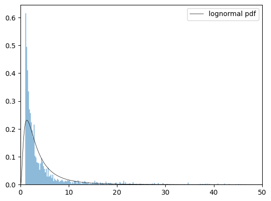 ax.plot(x, dist_lognorm.pdf(x), 'k-', lw=0.5, label='lognormal pdf')
