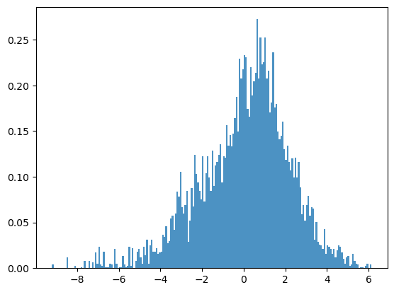 ax.hist(ln_sample, density=True, bins=200, histtype='stepfilled', alpha=0.8)