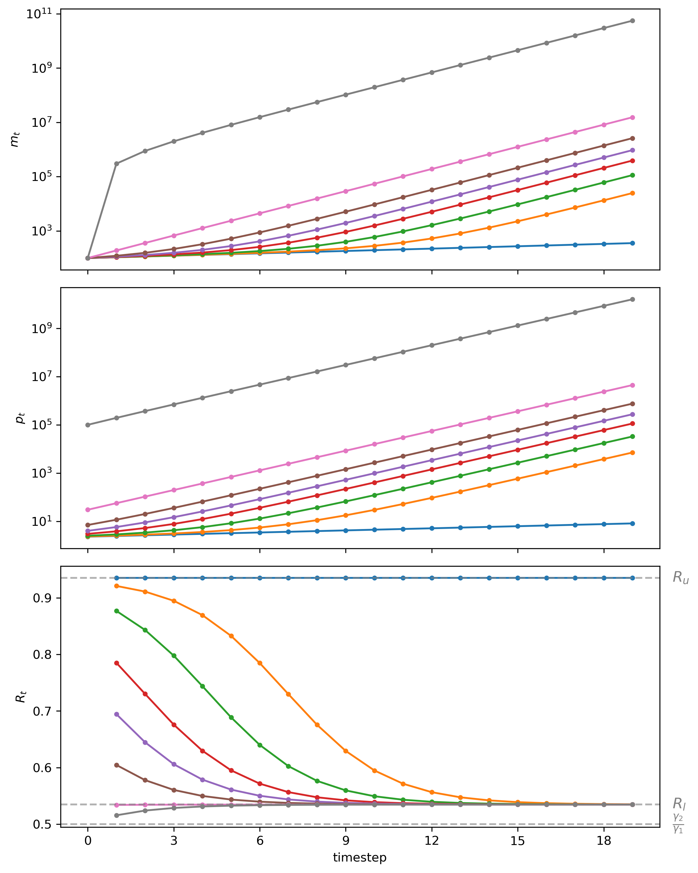 Please notice that for \(m_t\) and \(p_t\), we have used log scales for the coordinate (i.e., vertical) axes.