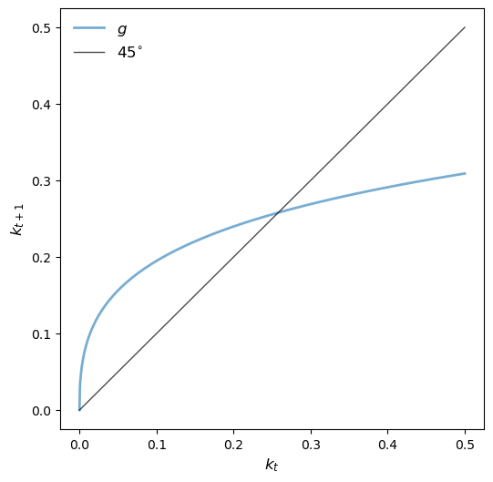 Then we can use scipy.optimize.newton to solve \(f(k_{t+1}, k_t)=0\) for \(k_{t+1}\).