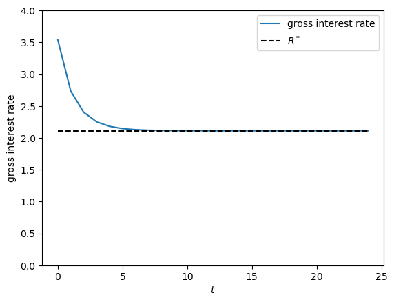ax.plot(range(ts_length), np.full(ts_length, R_star), 'k--', label="$R^*$")