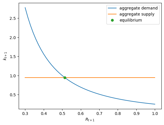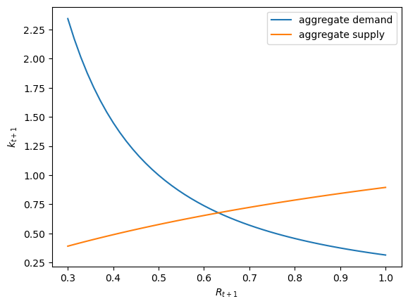 The next figure plots the supply of capital, as in (27.6), as well as the demand for capital, as in (27.11), as functions of the interest rate \(R_{t+1}\).