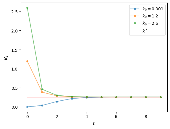 Generate three time paths for capital, from three distinct initial conditions, under the parameterization listed above.