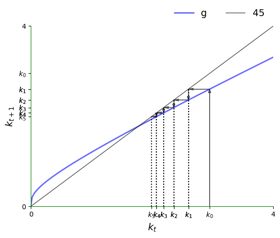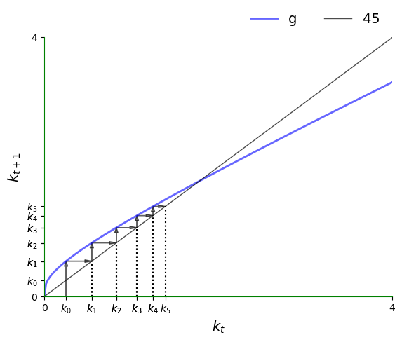 If \(g\) hits the 45-degree line at this point, then we have \(k_{t+1} = k_t\), so \(k_t\) is a steady state.