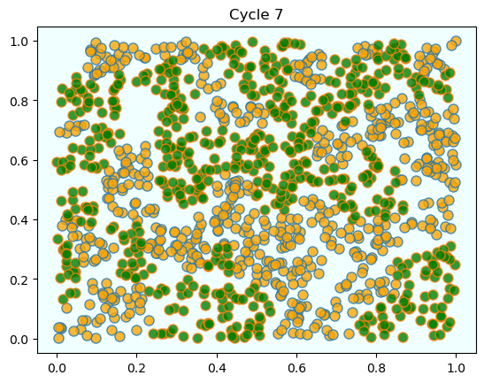 Orange agents are represented by orange dots and green ones are represented by green dots.