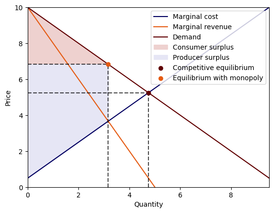 Define a function that plots the demand, marginal cost and marginal revenue curves with surpluses and equilibrium labelled.