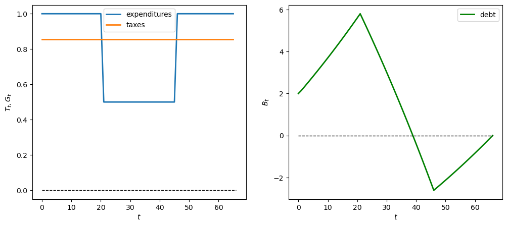 The above procedure seems like a sensible way to find “budget-feasible” tax paths \(T\), i.e., paths that are consistent with the exogenous government expenditure stream \(G\), the initial debt level \(B_0\), and the terminal debt level \(B_{S+1}\).