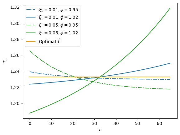 We visualize variations for \(\xi_1 \in \{.01, .05\}\) and \(\phi \in \{.95, 1.02\}\)