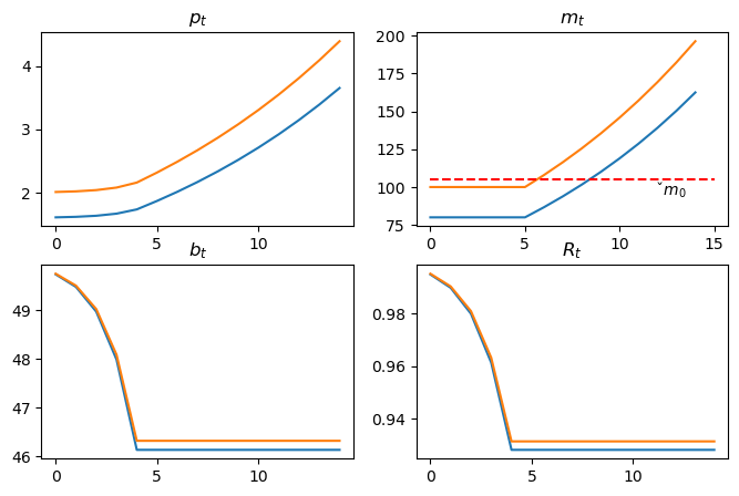 We want to compute an equilibrium \(\{p_t,m_t,b_t, R_t\}_{t=0}\) sequence under this scheme for running monetary and fiscal policies.